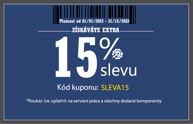 Jako poděkování získáváte extra slevu 15%. Je to jednoduché, stačí pouze nahlásit našim technikům při další pravidelné servisní prohlídce nebo servisním zásahu kód kuponu: SLEVA15 a je to!